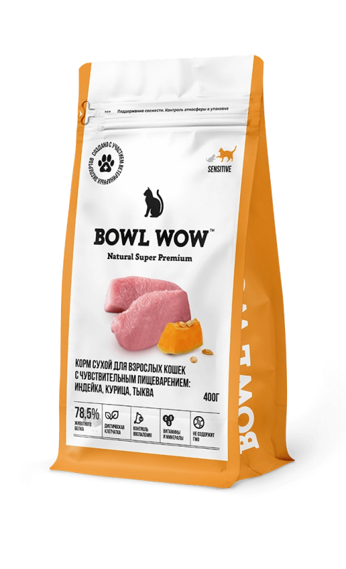 Купить BOWL WOW Сухой корм для кошек с чувствительным пищеварением с индейкой, курицей и тыквой, 400г с доставкой по Нижнему Новгороду в Зоомагазин «Гав-Гав».