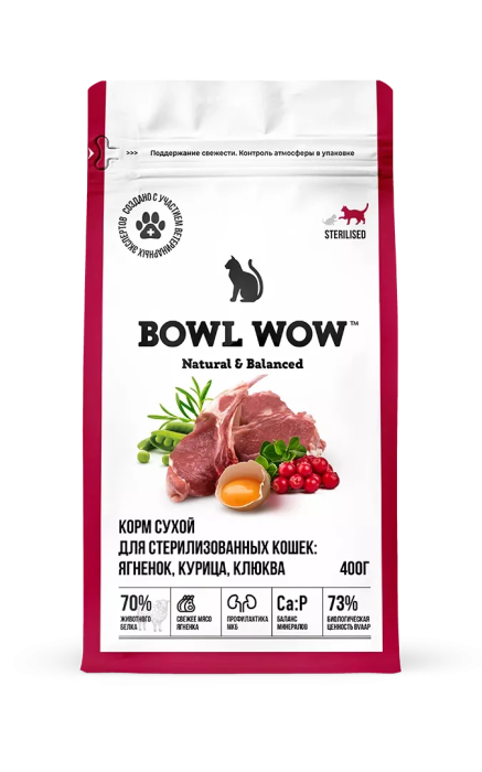 Купить BOWL WOW Сухой корм для стерелизованных кошек Ягненок, курица, клюква, 400г с доставкой по Нижнему Новгороду в Зоомагазин «Гав-Гав».