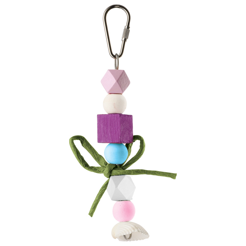 Игрушка-подвеска для птиц в виде разноцветных деревянных кубиков и ракушки на конце. Крепление: карабин. Цвет: сиренево-белый. Размер: 125/160*50мм.
