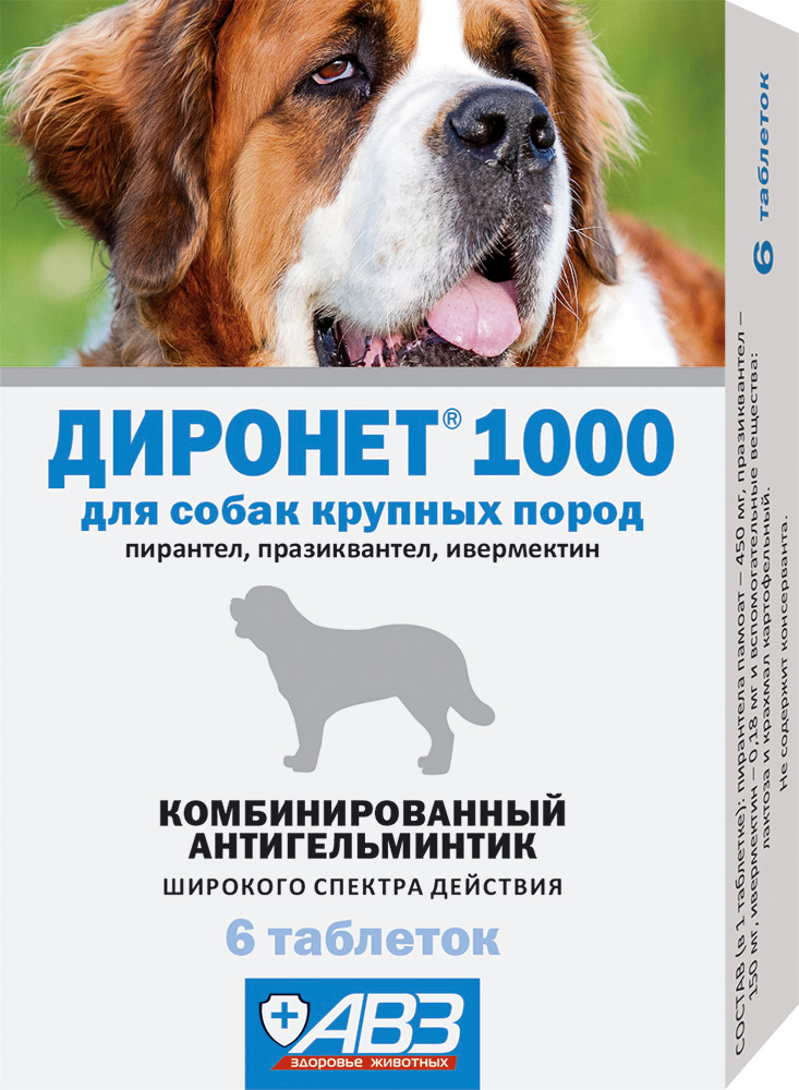 Диронет 1000 предназначен для собак крупных пород, содержит в одной таблетке пирантела памоат 450 мг, празиквантела 150 мг и ивермектина 0,18 мг. Доза - 1 таблетка на 30 кг массы тела животного.