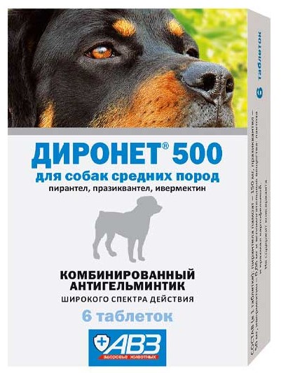 Диронет 500 предназначен для собак средних пород, содержит в одной таблетке пирантела памоат 150 мг, празиквантела 50 мг и ивермектина 0,06 мг. Доза - 1 таблетка на 10 кг массы тела животного.